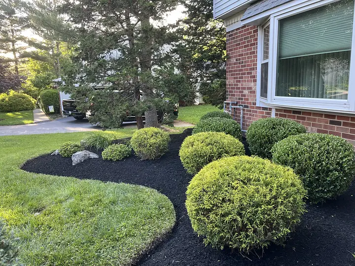 Fresh mulch, shaped shrubs, and a clean edge create a sharp, well-kept front-yard bed that boosts curb appeal and highlight the homes landscaping.